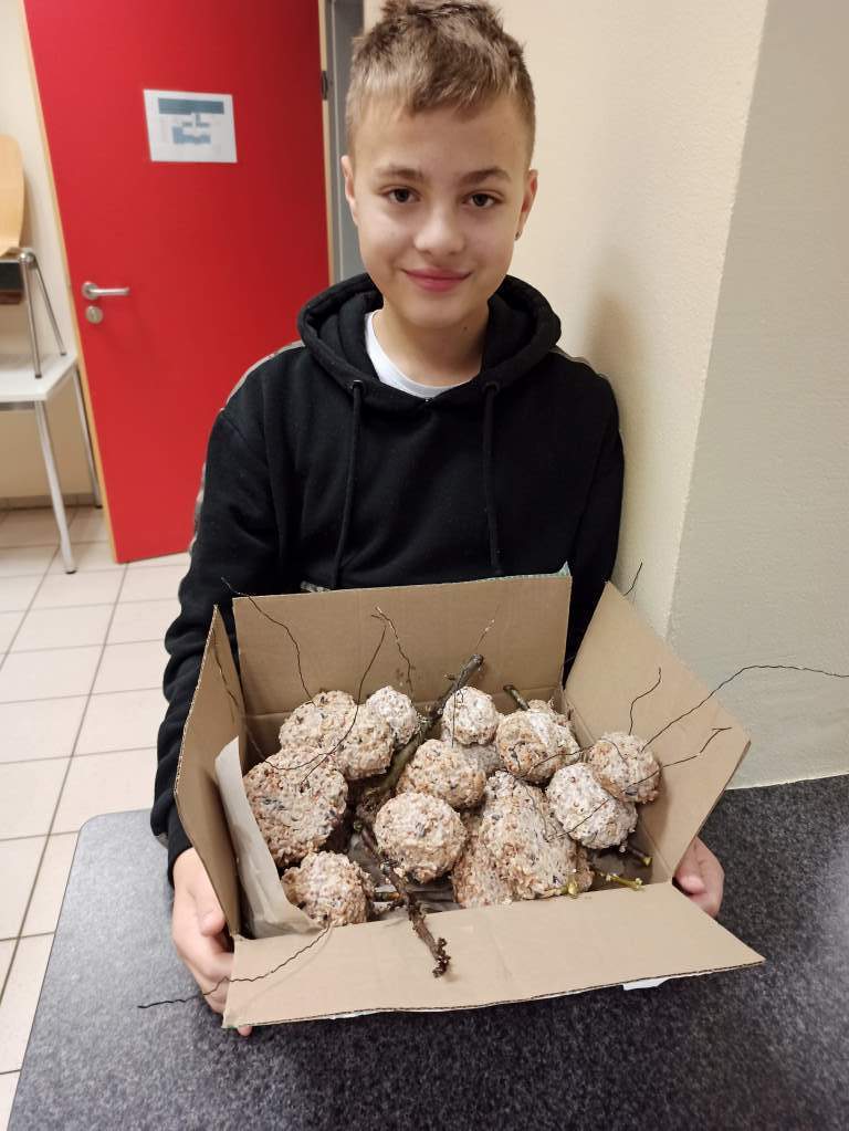 Im Jahr 2019 haben die Klassen 7 a und b im Schulgarten gearbeitet und unter anderem auch eine Wildkamera aufgehängt. Diese haben wir neben den Meisenknödeln positioniert, um zu sehen, welche Vögel angelockt werden. Es wurden verschiedene Vögel fotografiert: Blaumeisen, Kleiber, Rotkehlchen und Tauben.