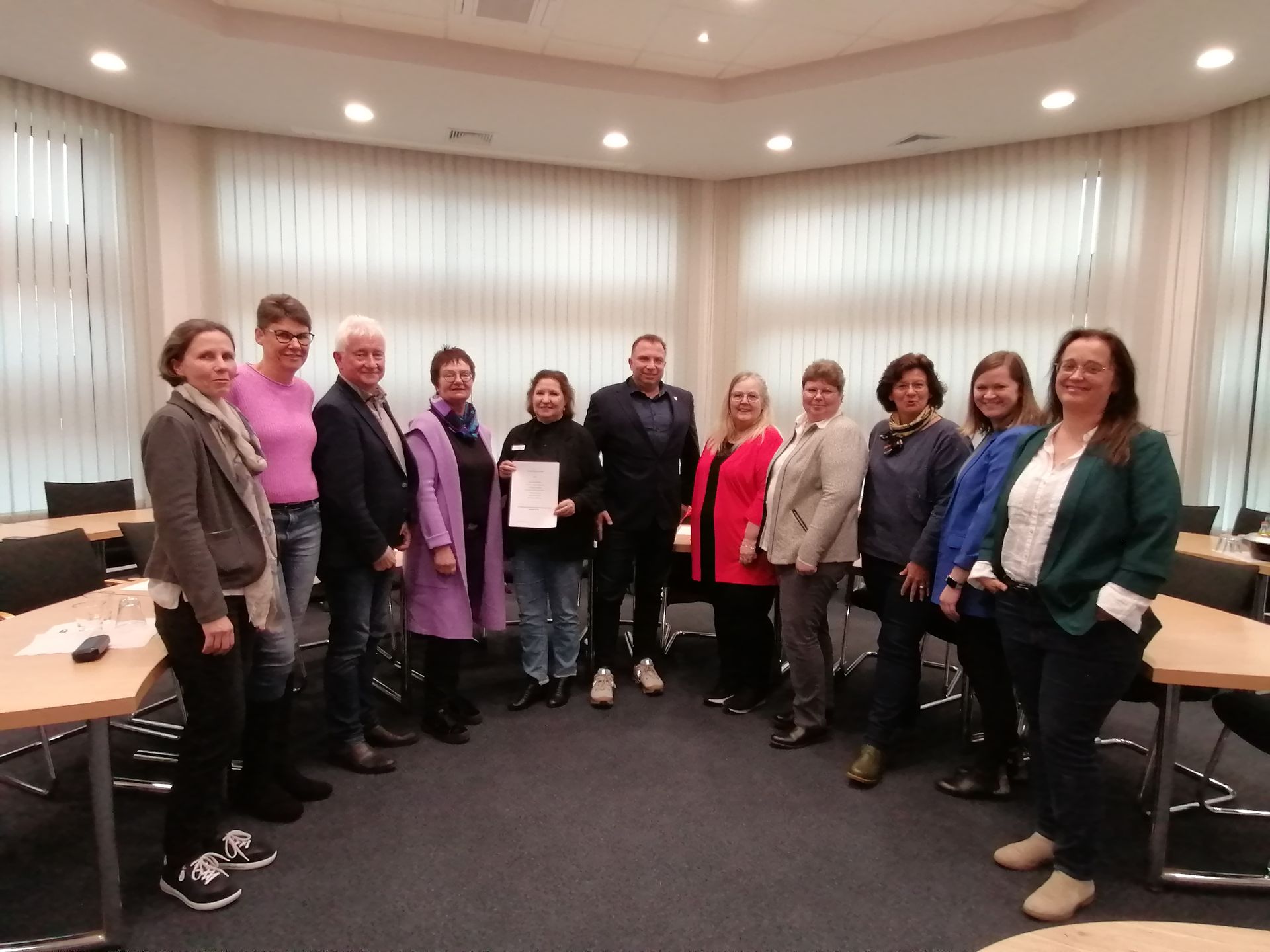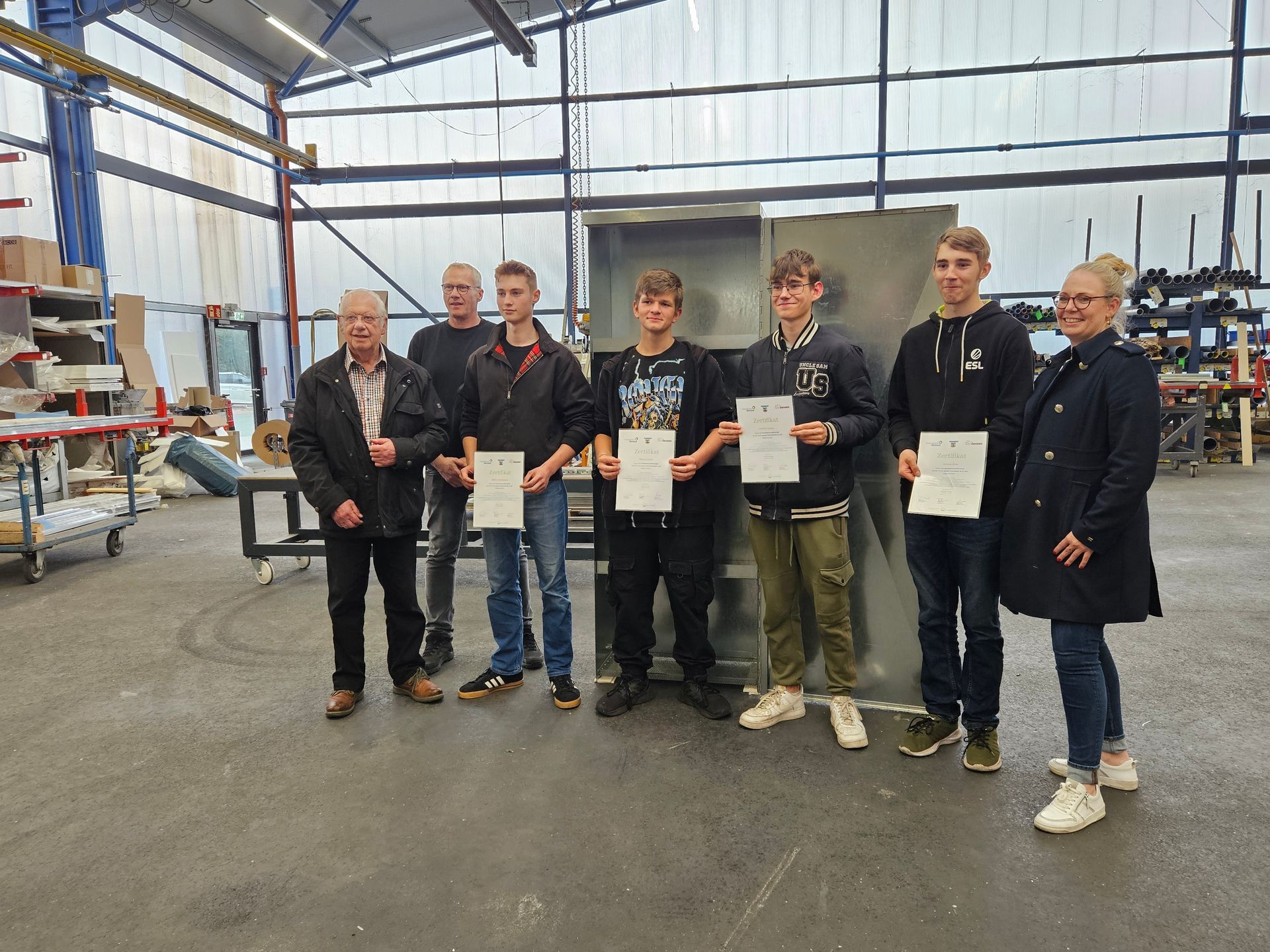 (auf dem Foto, von links: Frau Kordes, Herr Papen, Herr Stücker, Frau Albers (von den oben genannten Betrieben), Frau Wildermann (Schulelternratsvorsitzende), Frau Pansegrau (Schulleiterin), Frau Minnaert (Vorsitzende des Fördervereins).